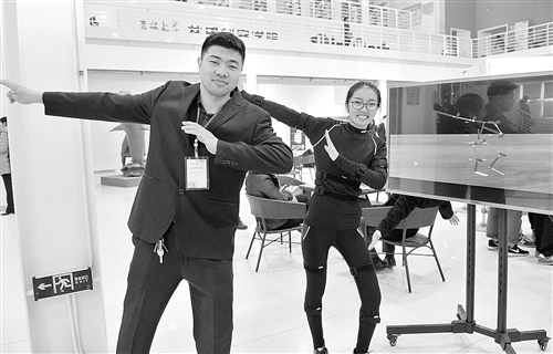 东北大学“无线动作捕捉传感器”项目创始人龚佳乐(左)及其团队成员李琪(右)在投资洽谈会上展示“无线动作捕捉传感器”(10月19日摄)。新华社记者 许 畅摄