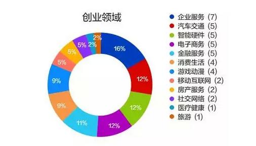 企业服务最多,汽车交通、智能硬件、电子商务次之,金融服务紧跟其后,分别占比16%、12%、12%、12%、11%,医疗健康、旅游最少,分别占比2%、2%。