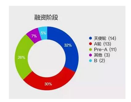 天使轮、Pre-A、A轮差不多各占1/3,分别是:14家、11家和13家,另外B轮有2家。