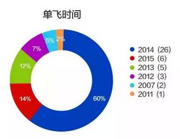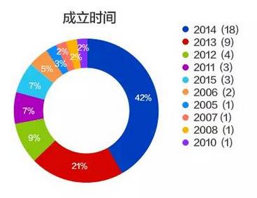 平均成立时间2.4年,大都是2014年和2013年成立,分别占比42%、21%,2005、2007、2008、2010年成立的最少,2012年是一个明显分界点。