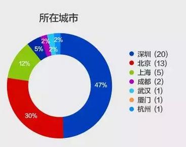 主要集中在深圳、北京和上海,深圳接近一半,分别为:47%、30%、12%,成都、杭州、武汉、厦门也有优秀创业者。