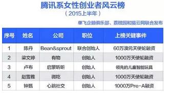 最新发布的《榜单》中收录了2015上半年在创业路途中,腾讯系最有潜力的43名创业者,其中《腾讯系创业人物风云榜(2015上半年)》收录35人、《腾讯系30岁以下创业者风云榜(2015上半年)》收录18人、而《腾讯系女性创业者风云榜(2015上半年)》收录了5人(部分单飞企鹅重叠上榜),其中后两个榜单也是首次发布。