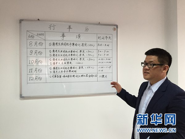 如今,孟宪霆构想的平台正有条不紊地运转着。看好平潭“综合实验区”和“自贸区”政策叠加蕴藏的光明前景,不久前他把机构落户在平潭台湾创业园。墙上的行事历显示,从8月到11月,公司每个月都会组织台湾学生出团赴平潭培训、鉴定,相关工作已安排到了12月份。