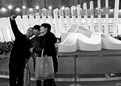 昨天,参观者用手机自拍功能跟双创标识合影。 本报记者 吴镝摄