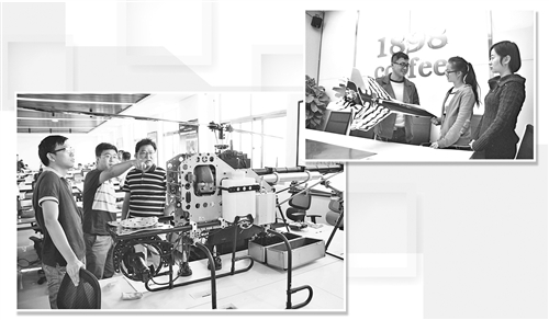 左下图 兰州科技大市场投入运营当天,一家企业展示的无人机吸引众多同行业创客关注。 右上图 在众创空间的1898咖啡馆内,甘肃启远智能科技公司工作人员正与另外几名创客交流航模制作经验。照片由本报记者 陈发明摄