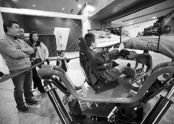 武汉创业创新博览会上,市民正在围观一位工作人员调试7D赛车游戏平台。