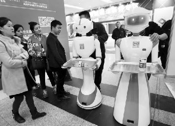 两台智能机器人提前入驻创业创新博览会,吸引了不少市民围观。