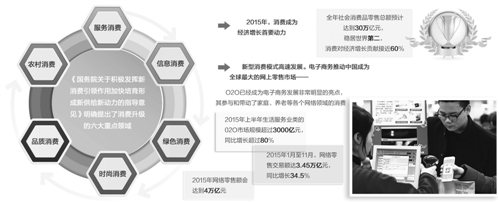新型消费模式高速发展。电子商务已经成为我国现代流通创新发展最有活力和潜力的领域,推动中国成为全球最大的网上零售市场。2015年以来,移动电商呈现爆发式增长,线上线下加速融合。“O2O已经成为电子商务发展非常明显的亮点,其参与和带动了家庭、养老等各个领域的消费。我们有一个数据,2015年上半年生活服务业类的O2O市场规模超过3000亿元,同比增长超过80%。O2O市场中又有三个数据,一是在线旅游增速超过60%,二是O2O本地生活服务业增速超过70%,三是O2O餐饮外卖增速接近40%。”商务部电子商务司副司长聂林海说。2015年1月至11月,网络零售交易额达3.45万亿元,同比增长34.5%。预计2015年网络零售额会达到4万亿元,位居世界第一。