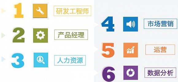 当前互联网行业最为热门的六大职位分别是研发工程师、产品经理、人力资源、市场营销、运营和数据分析。