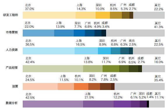 此外,市场营销与运营岗位的人才地域分布相对分散一些,而在本身数目就不多的数据分析人才中88.9%都集中在北京等前六名城市当中,可见其它城市的数据分析人才更加紧缺。