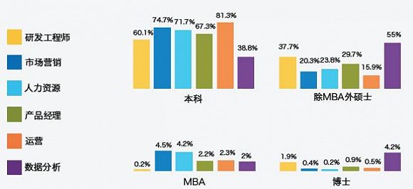 二、教育背景:数据分析岗学历最高 市场营销和HR岗多MBA