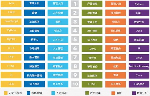 对于研发工程师及数据分析人才来说,掌握一定的程序语言技能十分重要;产品经理需要了解产品、重视用户体验,HR需要吸引人才、管理员工,这些在对应人才的工作技能中都有所体现。