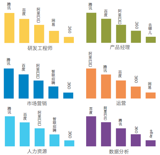 中国互联网热门职位的人才从业公司TOP5中,百度、阿里巴巴、腾讯占据各岗位前三名。