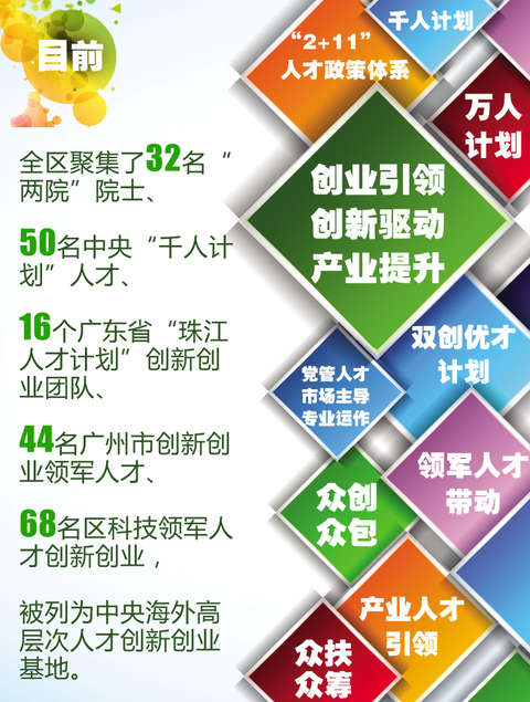 目前全区聚集了32名“两院”院士、50名中央“千人计划”人才、16个广东省“珠江人才计划”创新创业团队、44名广州市创新创业领军人才、68名区科技领军人才创新创业,被列为中央海外高层次人才创新创业基地。
