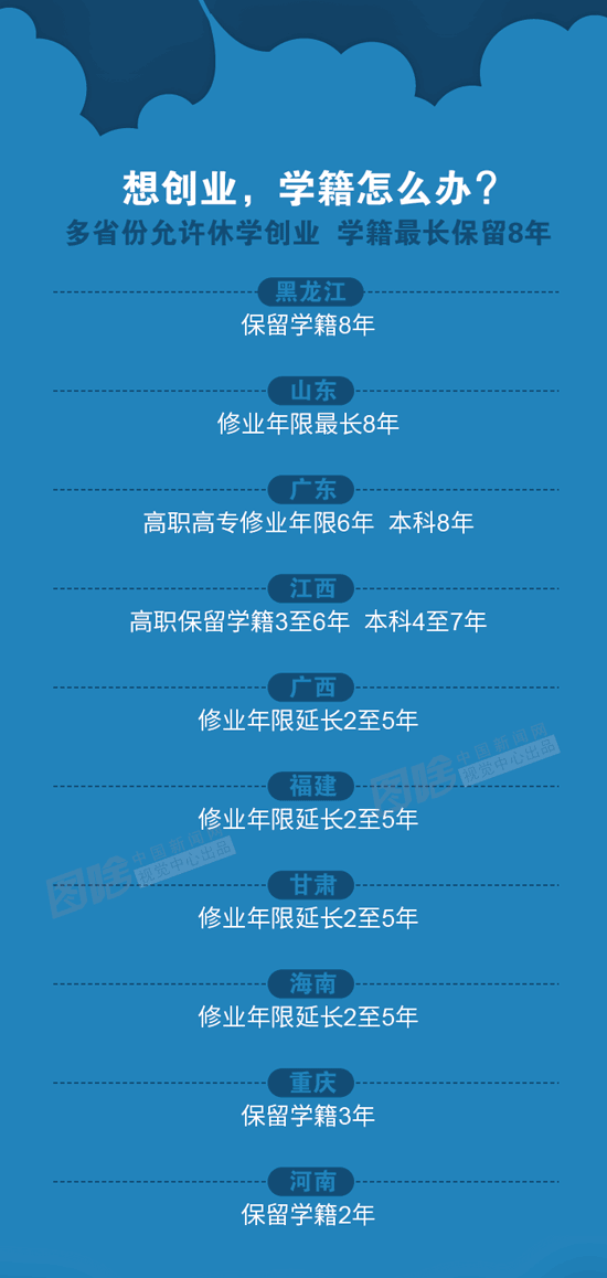 黑龙江、山东、广东、江西、广西、福建、甘肃、海南等多个省份出台政策明确大学生在校期间修业年限,其中广东、江西对高职高专也作出了规定,广东高职高专延长休学创业年限至6年、江西高职为3-6年。陕西、贵州、四川、上海、内蒙古、湖北、湖南、天津、吉林、安徽、云南、河北等多个省份也允许实施弹性学制,保留学籍休学创业,但未给出具体修业年限。