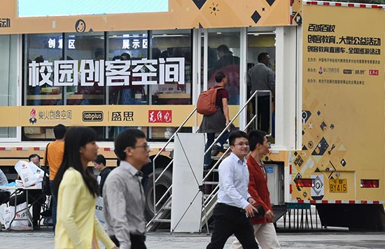 图:近年来,福建鼓励创业创新热潮。图为去年福州举办的中国教育装备展上校园创客空间宣传活动/资料图片