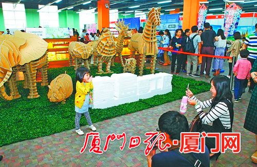 宝岛梦工厂掀起体验热,小朋友在文创产品前留影。