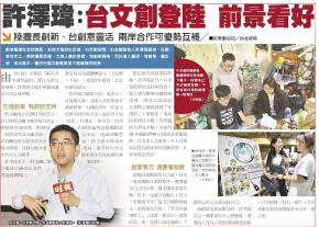 2016年8月27日,由《旺报》主办的“2016第一届两岸青年创业论坛”在中国台湾省新北市举办,91投资、91众创空间、91金融董事长许泽玮受邀出席并作主题演讲。许泽玮表示,在创新创业合作上,两岸三地生态优势互补,大陆人善于学习、有创新精神,而台湾人灵活、有创意、懂生活。非常看好台湾文创产业到大陆发展的前景。