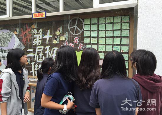 台湾学生在看橱窗内展示的教师节祝福语/田雯摄