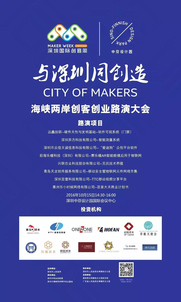 2016年10月14日15:00-15:30,第二届深圳国际创客周海峡两岸青年创业主题活动启动仪式。此次启动仪式正式拉开全国海峡两岸青年创业主题活动帷幕,国家部委、省、市等各级领导及嘉宾莅临现场,其中海协会会长陈德铭、深圳市委常委、统战部部长林洁也将参与启动并致辞。启动仪式中,中芬设计园将与台湾兴联农业科技股份有限公司签约,开启深层次的合作和发展模式,并举行深台智能建筑创新中心,以及联想加速器战略合作示范基地的挂牌仪式,作为中芬设计园在两岸创新创业上的全新孵化成果。充分展示全国各个海峡两岸青年创业基地及示范点在推动大众创业万众创新及孵化培育优秀创客创业项目上做出的努力,为台湾青年来大陆发展提供良好的土壤,为促进更多两岸优质创新创业成果落地助力。