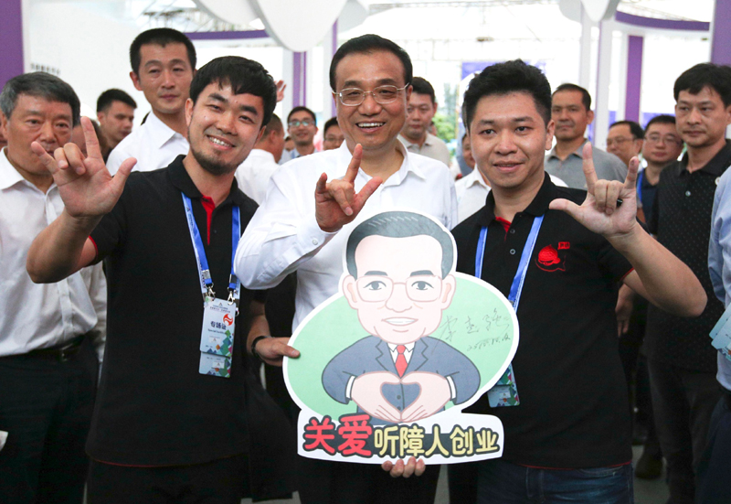 【李克强用“爱”的手势为听障创业团队加油】“总理,我们这个手势是听障人国际手势,表示‘爱’的意思。”在一位听障创业团队负责人示范下,总理也打出同一手势。这是12日下午全国双创周深圳主会场上动人的一幕。李克强对这一创业团队给予特殊关注,并应邀在“关爱听障人创业”画板上签上自己的名字。