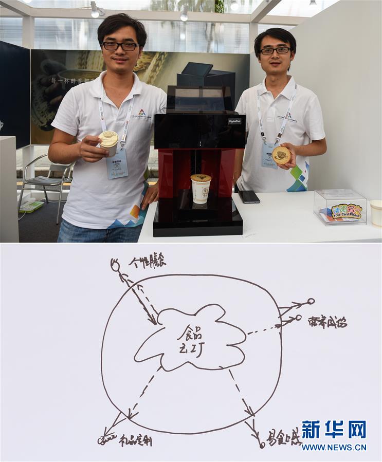 上图:10月13日,来自深圳膳云科技公司的李响(右)和王传建展示他们研发的咖啡拉花机,这台机器在10秒之内就可在咖啡泡沫或者饼干上打印出想要的任意图案;下图:李响绘图表示,希望能做一个食品云工厂,可以根据家人的身体状况与需求在工厂定制食品,再由最近的加工店做好安全美味的食物送往家人住处(拼版照片)。 新华社记者毛思倩摄