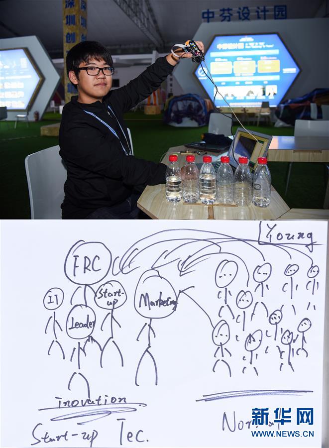 上图:10月12日,深圳本土“小创客”吴子谦展示他带来的作品——产品库存感应仪,今年19岁的他已经申请了40多项专利;下图:吴子谦绘图表示,他未来计划就读教育专业,成为一个能帮助越来越多年轻人实现创客理想的人,让大家根据能力担任创业团队的领导者、软硬件研发人员、市场专员等(拼版照片)。新华社记者毛思倩摄