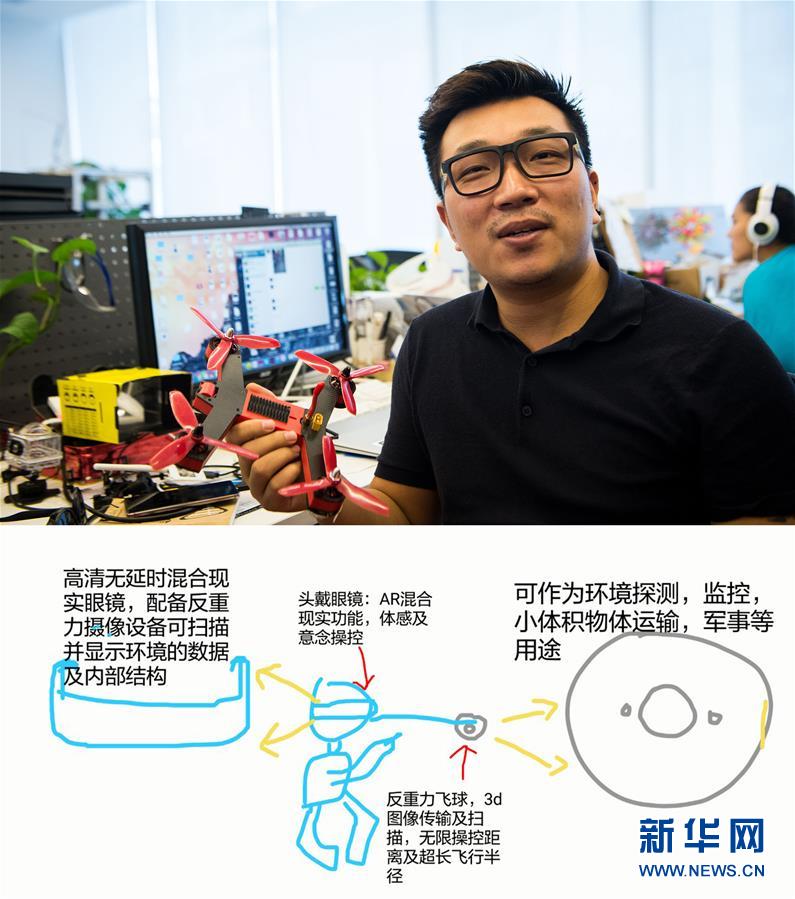 上图:10月11日,FPVSTYLE团队的创始人马峥展示和团队研发的产品。他们研发的“独角兽”第一视角飞行器与市面上的航拍无人机不同,主打竞速飞行,时速达到100公里;下图:马峥绘图表示,希望能做一款高清无延时混合现实眼镜,配置反重力摄像设备可扫描并显示环境的数据及内部结构,此外,希望做一款反重力飞球,具有3d图像传输及扫描的功能,和无限操作距离以及超长飞行半径(拼版照片)。新华社记者吕帅摄