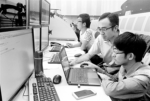 晁京(中)和同事探讨信息平台建设课题。经济日报记者 李治国摄