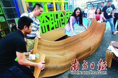 深圳创客数量已经过万,今后每年将举办创客周活动。图为文博会期间创客展示的一款可伸缩环保纸凳。南方日报记者 鲁力 摄