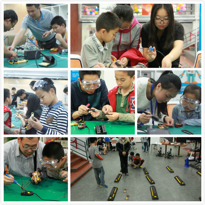 通过简单的介绍,让参与活动的家长和小朋友对机器人有初步的了解。随后,老师带领大家观看了展示的机器人,让大家近距离接触机器人。当然,光是看是不够的。接下来的环节就——家长和小朋友一起动手组装机器人战车。