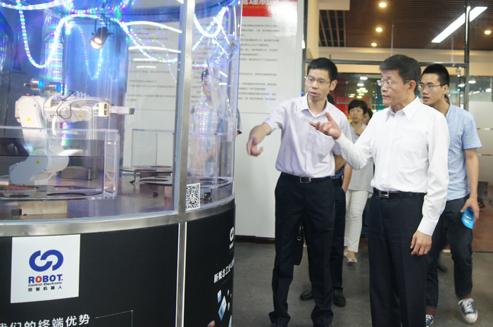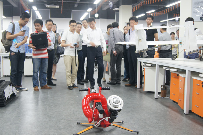 在听取孵化基地及海沧区众创空间发展情况等介绍后,黄文涛局长一行还与创业团队交流,观看机器人演示。比如会泡咖啡的机器人、便携式无人机、消防机器人等。其中,由唐峰科技研发的消防机器人是首次在孵化基地亮相。消防第一次亮相就获得了大家的称赞。