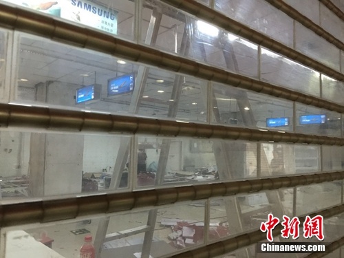 海龙电子城1楼,透过闸门,可以看到有人在整理现场。中新网吴涛 摄