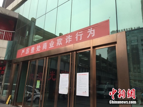 海龙电子城门口“严厉查处商业欺诈行为”横幅还存在。中新网吴涛 摄