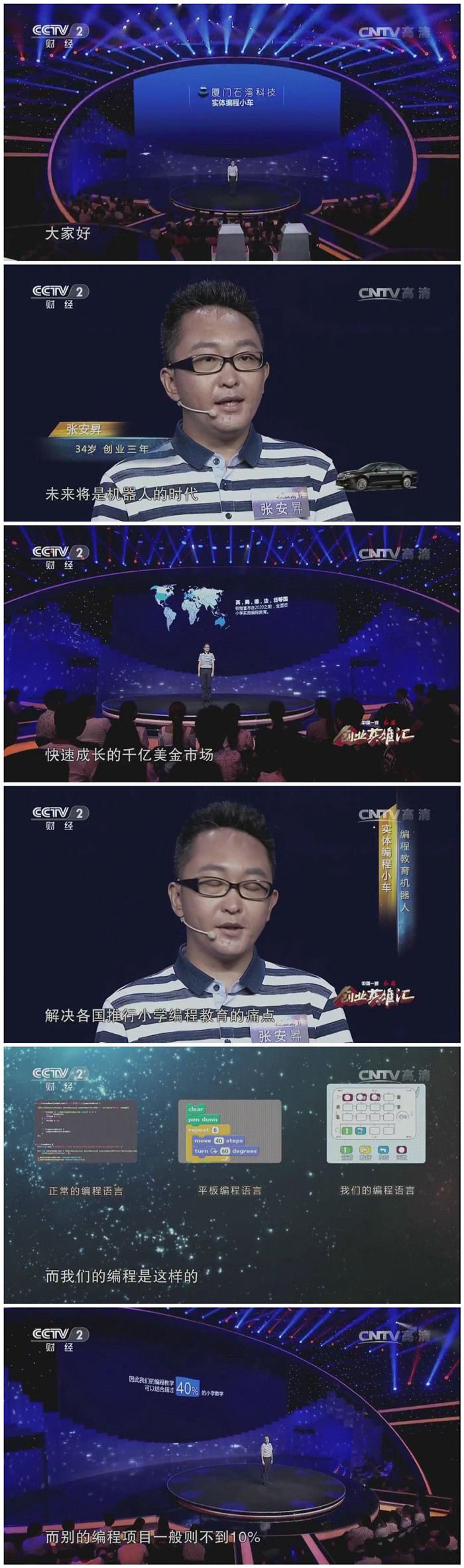7月22日晚,CCTV2央视财经频道大型励志类创业节目——《创业英雄汇》,又迎来了三位创业者。一品创客·海峡两岸无人机暨智能机器人孵化基地的孵化项目——实体编程小车(厦门石湾科技)走上了《创业英雄汇》的舞台。