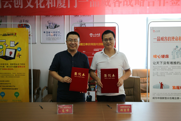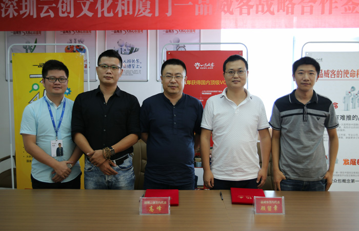 又一重量级服务商加入一品威客网!7月29日下午,深圳云创文化与一品威客网在厦门举行了签约仪式。接下来,双方将通过紧密的合作,打造双赢、可持续发展的战略合作伙伴关系,充分发挥各自优势,为用户提供更好的产品及服务。