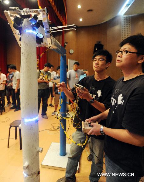 Two undergraduates of Mechanics Faculty take part in the robot contest in emulating a traditional southern Chinese folklore of grabbing for the oblations by speeling onto the single mast on the Hungry Ghost Festival with the intent to scare away the ghost souls, during the 17th Mechanical System Devise Theme Contest of the "National Taiwan University of Science and Technology (NTUST)" at Taipei, southeast China's Taiwan, June 8, 2010. This contest entails the robots to speel onto the mast and climb over the rail to light up the LED lamp in the middle of the rail, with the least time-consumer emerging as the winner. (Xinhua/Wu Ching-teng) |