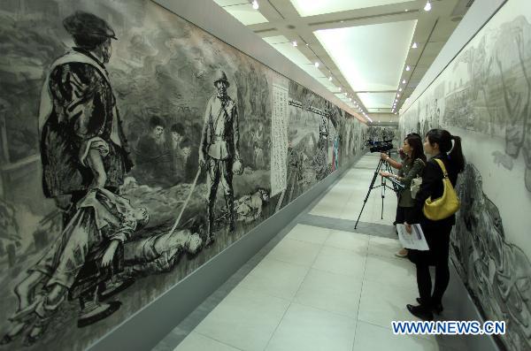 A journalist takes video for a scroll painting describing China's Anti-Japanese War (1937-1945) in Taipei, southeast China's Taiwan, on July 6, 2010. The 800-meter-long scroll painting, created by painters from the Chinese mainland, will be exhibited in Taipei from July 7 to 31. (Xinhua/Fei Maohua) |