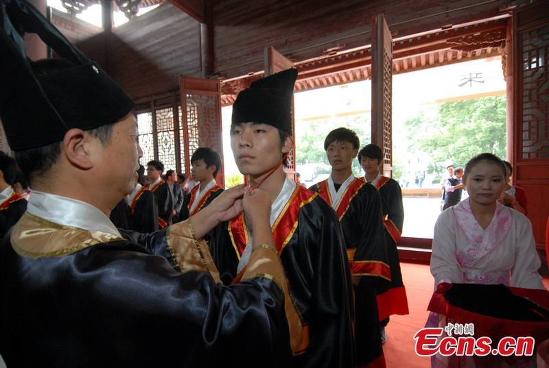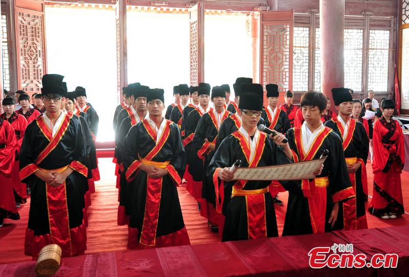 A group of ten students from New Taipei City Mingder High School, Taiwan, joins 46 local youngsters in a traditional ceremony celebrating their reaching of adulthood at the Confucian Temple in Fenghua, east China’s Zhejiang Province, September 21. [CNS Photo/Xu Xiaoyong]
