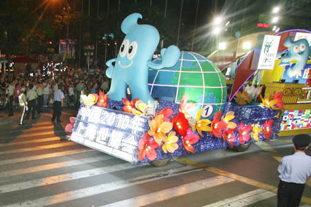 A flowery float in the shape of "Haibao", mascot of the 2010 Shanghai World Expo, shows up during the opening pageant of the 2009 Shanghai Tourism Festival on Huaihai road in Shanghai, east China, Sept. 12, 2009. Twenty-two flowery floats and 35 performing teams from at home and abroad took part in the pageant on Saturday. (Xinhua Photo) |