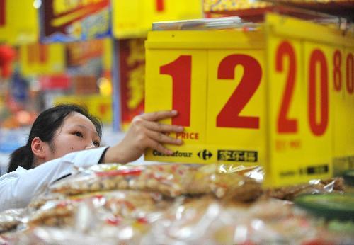A saleswoman adjusts price tags at a local supermarket in Guangzhou, capital of south China's Guangdong Province, Jan. 21, 2010. According to National Bureau of Statistics, China's consumer price index (CPI), a main gauge of inflation, rose 1.9 percent year on year in December last year, and fell 0.7 percent for the full year in 2009. (Xinhua/Chen Yehua)