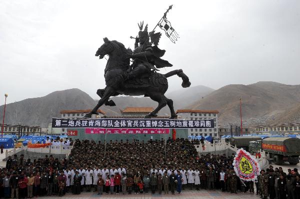 Soldiers and local residents pay silent tribute to the victims of Yushu earthquake during a mourning ceremony at King Gesar's Square in Gyegu Town of Tibetan Autonomous Prefecture of Yushu, northwest China's Qinghai Province, April 21, 2010. (Xinhua/Zhu Xiang)