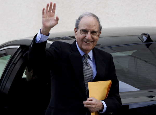 U.S. envoy to the Middle East George Mitchell waves to media upon his arrival to meet with Palestinian President Mahmoud Abbas in the West Bank city of Ramallah, May 8, 2010. U.S. peace envoy Senator George Mitchell arrived in Ramallah on Saturday evening for talks with Palestinian President Mahmoud Abbas to receive the Palestinian response over starting the proximity talks with Israel. (Xinhua/Fadi Arouri)