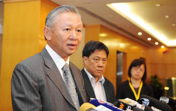 Secretary for Security Bureau of the Hong Kong government Ambrose Lee (L) speaks at a press conference in Hong Kong, south China, Aug. 23, 2010. Ambrose Lee confirmed on Monday that 15 tourists from Hong Kong were still held hostage by a gunman in the Philippine capital Manila. Lee said the Hong Kong government has set up a task force for the abduction incident, which was led by Lee himself. It has asked the Philippine government to put safety of the abducted Hong Kong residents as top priority. (Xinhua/Li Qiuchan)