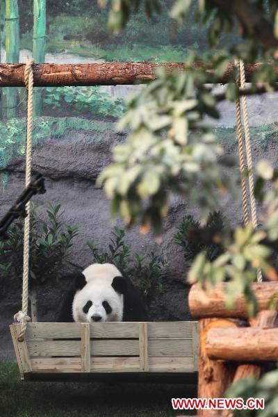Panda "Kai Kai" plays on the swings at the newly-launched panda pavilion in the Macao Special Administrative Region, south China, Jan. 18, 2011. Macao held the opening ceremony for its panda pavilion on Tuesday, indicating that Kai Kai and Xin Xin, the panda pair that China's central government presented Macao Special Administrative Region, are allowed to see the public after undergoing a month-long quarantine. (Xinhua/Cheong Kam Ka) |