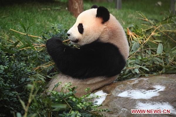 Panda "Xin Xin" eats fresh bamboo at the newly-launched panda pavilion in the Macao Special Administrative Region, south China, Jan. 18, 2011. Macao held the opening ceremony for its panda pavilion on Tuesday, indicating that Kai Kai and Xin Xin, the panda pair that China's central government presented Macao Special Administrative Region, are allowed to see the public after undergoing a month-long quarantine. (Xinhua/Cheong Kam Ka)