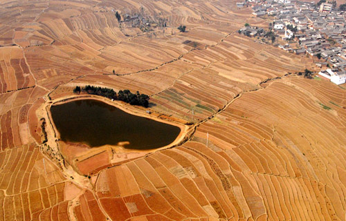 Photo taken on March 27, 2010, shows the aerial view of a drought-stricken lake in Xiangyun County, Dali, southwest China’s Yunnan Province. The drought has lingered in southwest China for months, affecting 61.3 million residents and five million hectares of crops in Guizhou, Yunnan, Sichuan provinces, Chongqing Municipality and Guangxi Zhuang Autonomous Region, the Ministry of Civil Affairs said. (Photo: chinanews.com.cn)