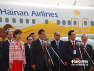Chinese Kuomintang (KMT) Honorary Chairman Lien Chan (C) made a speech as he arrived at Meilan Airport in the cap ital of Hainan Province on Monday...