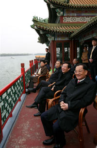 Honorary Chairman of the Chinese Kuomintang (KMT) Lien Chan (1st R) enjoys boating on the Kunming Lake during his visit to the Summer Palace in Beijing, capital of China, April 16, 2006. (Xinhua Photo)