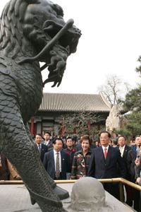 Honorary Chairman of the Chinese Kuomintang (KMT) Lien Chan (Front) views a bronze statue of kylin during his visit to the Summer Palace in Beijing, capital of China, April 16, 2006. (Xinhua Photo)